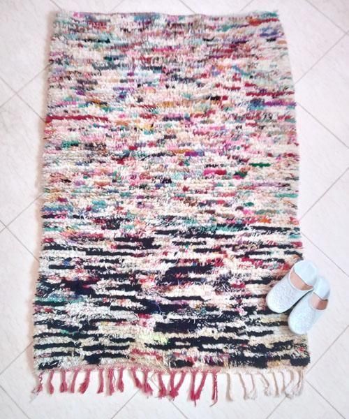 ピンクや赤など明るい色味に、シックな黒が入りモダン印象のラグ。